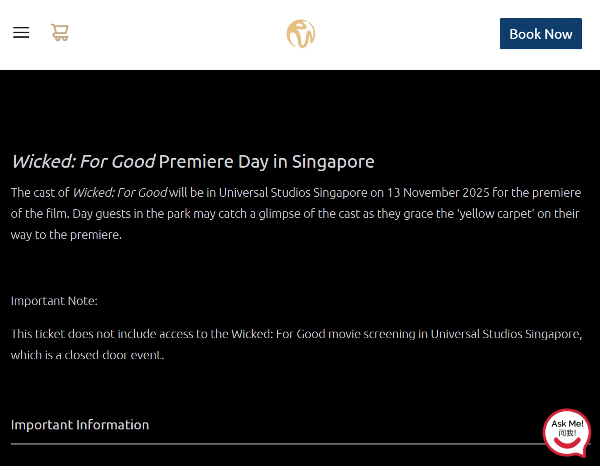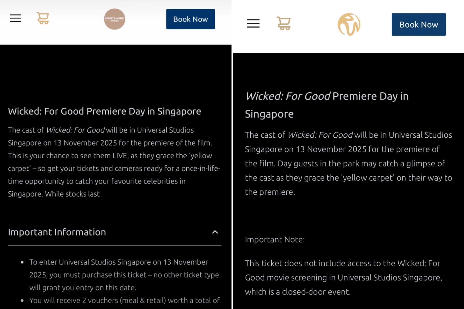 An RWS spokesperson told The New Paper on Oct 14 that, "The Universal Studios Singapore Premiere Day Special includes admission to the park, food and beverage and retail vouchers, and provides guests inside the park with a chance to catch a glimpse of the Wicked: For Good cast on the yellow carpet during the premiere day festivities."