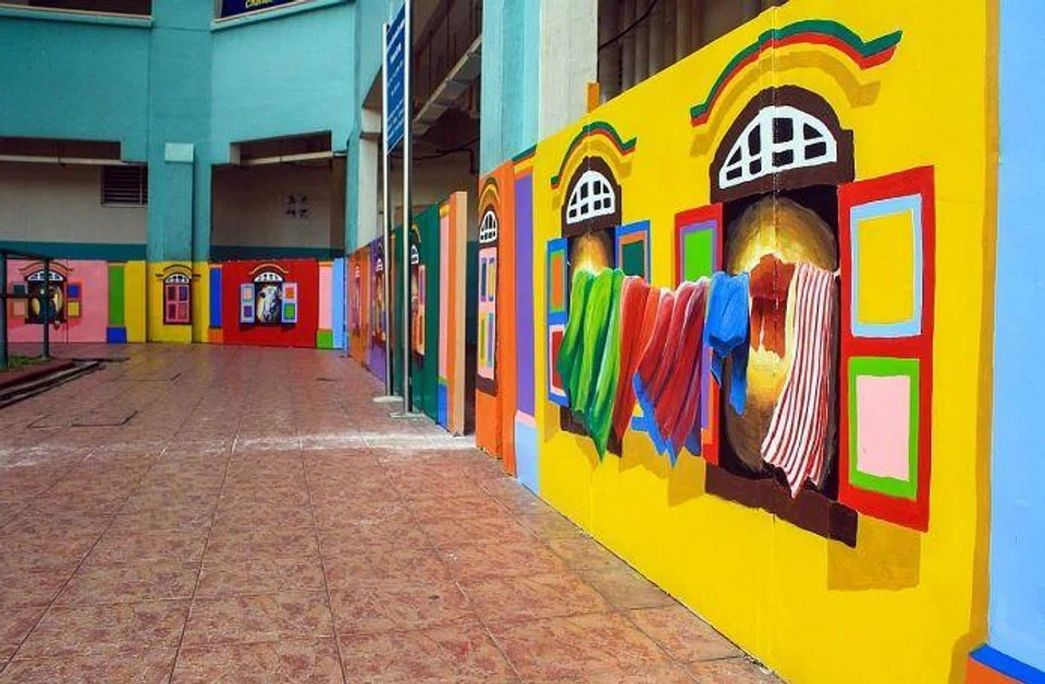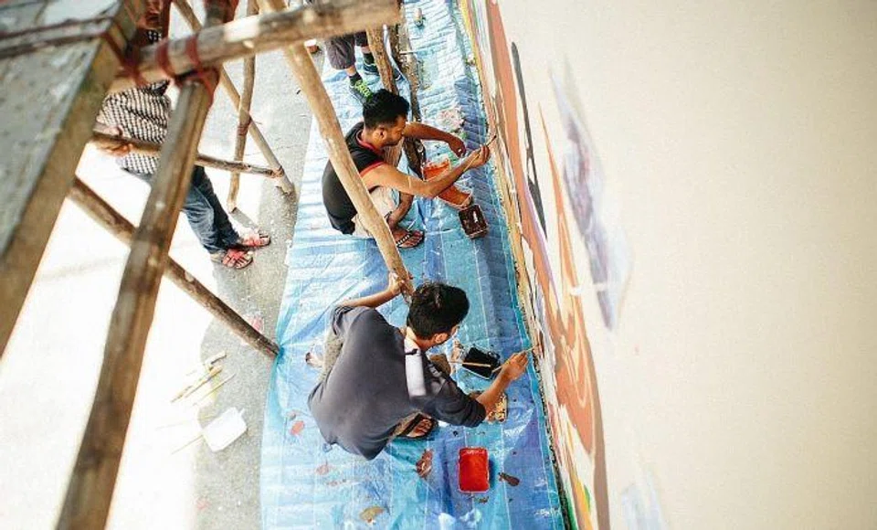 Migrant workers, teachers and students paint community mural to celebrate Race Course Road's heritage