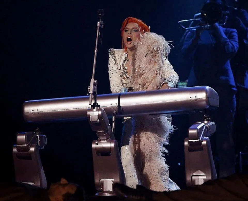 Belting out Space Oddity, Ziggy Stardust, Fashion, Let's Dance and more, Gaga (above) also went through a Bowie transformation on stage, thanks to visual effects that superimposed his iconic looks onto her face.