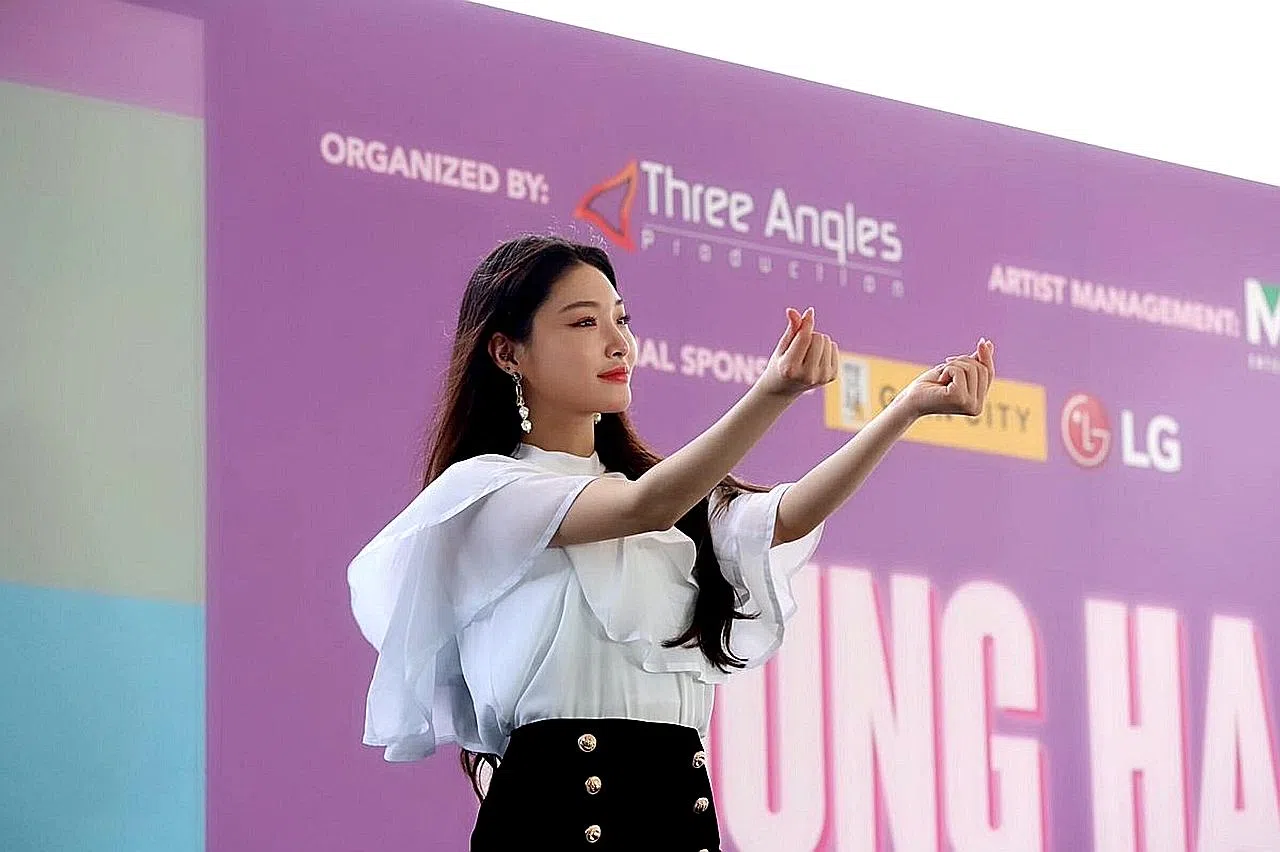 In Singapore for the first time for her maiden solo fan meet at Zepp@Bigbox that night, Chungha also addressed an open press conference at Gain City Megastore@Sungei Kadut. "It's been sad, everything's different without my girls," she said of being on her own.