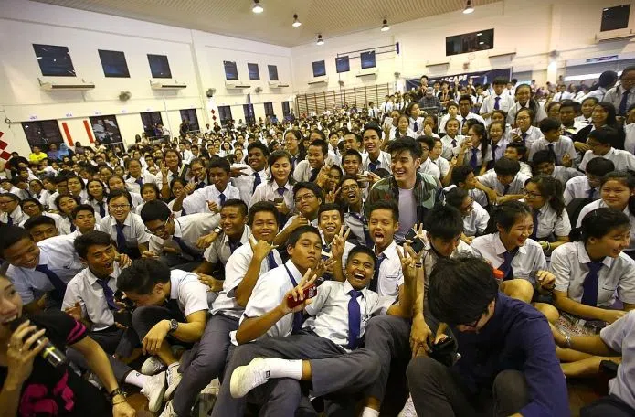 About 1,200 students from Canberra Secondary School got a treat during their school's afternoon assembly yesterday when local singers Nathan Hartono and Charlie Lim turned up to officially kick off the second edition of the *Scape Invasion Tour.