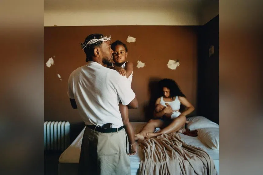 The album's cover is a photo of Lamar wearing a crown of thorns and holding a young child, while a woman who appears to be his partner Whitney Alford is in the background, holding an infant.