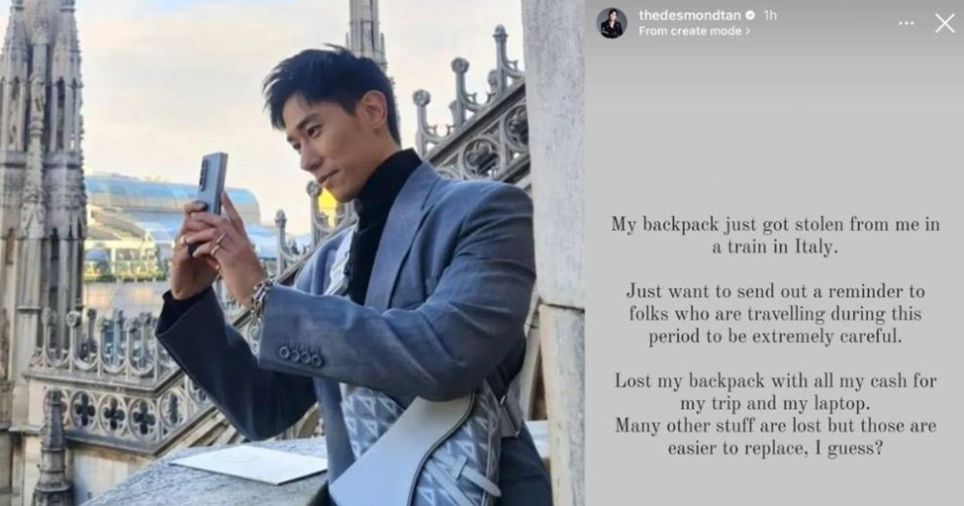 Singaporean actor Desmond Tan has had his personal belongings stolen while travelling on a train in Italy.