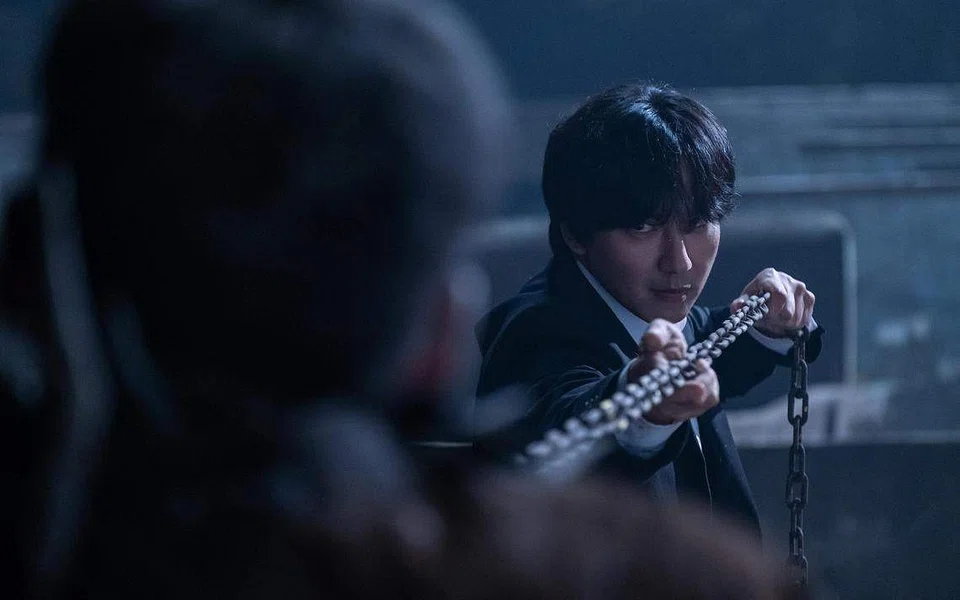 In his first scene, Cha is seen dressed in the traditional black cassock as he towers over a possessed woman on a bed and splashes holy water all over her.