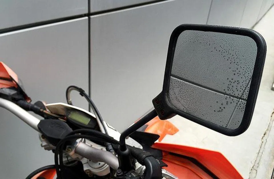 My rear-view mirror has also developed strange spots on it (below) while the lubrication on my motorcycle chain has lost its moistness.