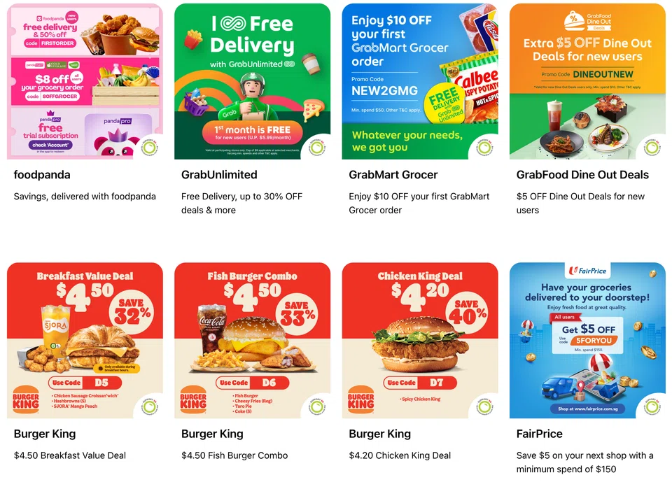 - FairPrice: $5 OFF next shop (Min. spend $150). $12 OFF first order (Min. spend $59) with code GROCERY12.