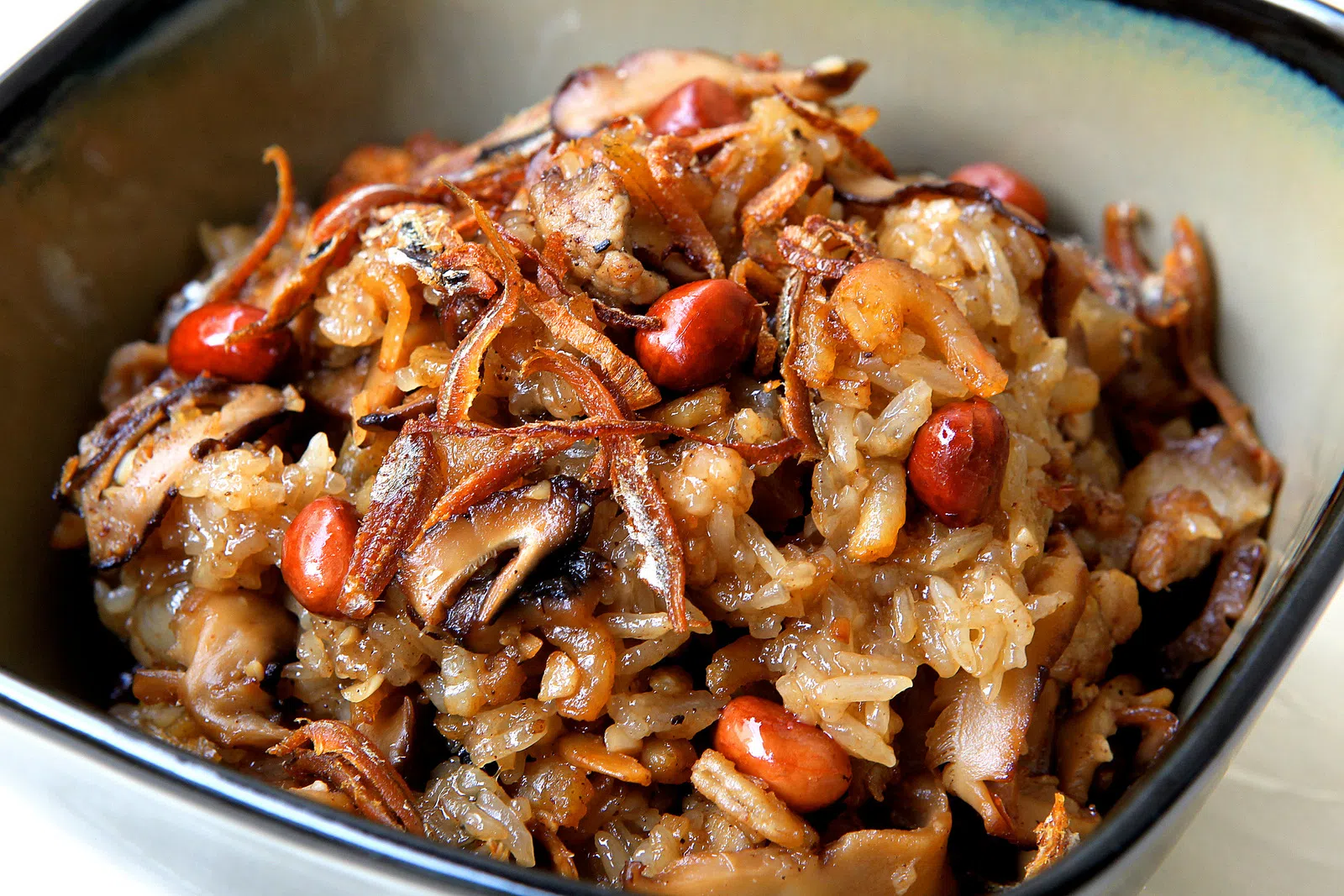 Soft yet chewy nut-studded sticky rice with lovely bits of dried prawns, mushrooms and pork.