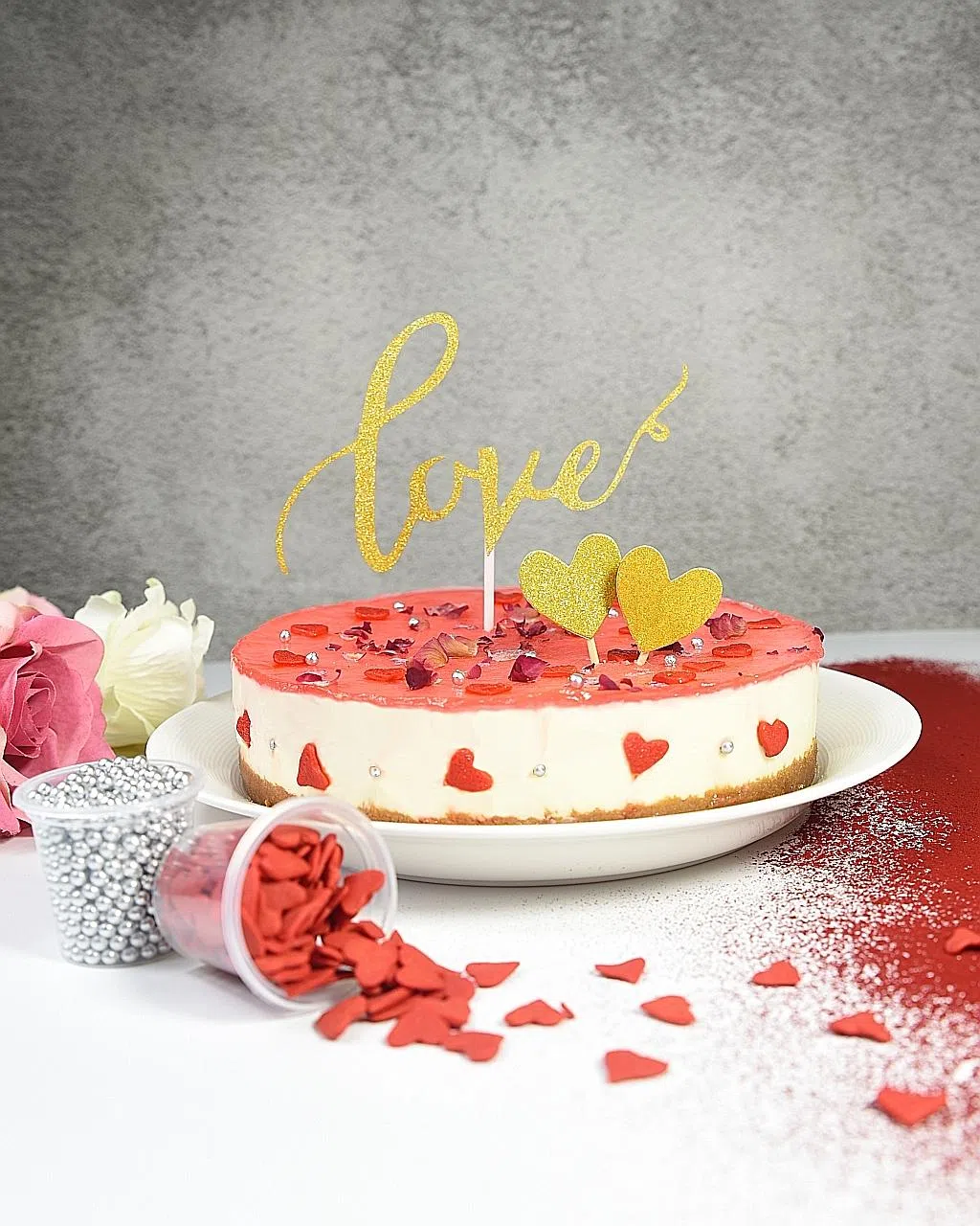 For added fun, the cake comes with red heart sprinkles, silver dragees and a "Love" cake topper, so you can decorate the cake in any way you want.