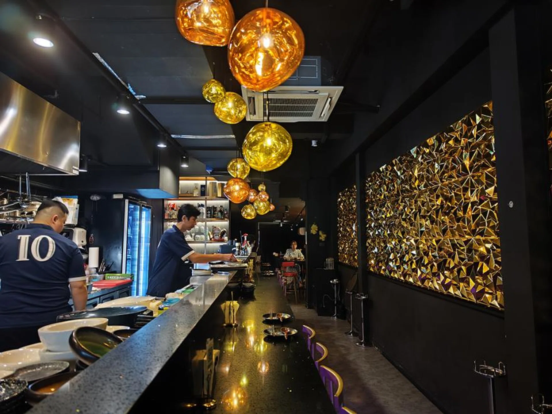 With its open kitchen, young diners can get a glimpse of the meal preparation without getting in anyone's way. The restaurant decor, with gold accents and dark set against a dark interior, earned the shophouse unit a Muse Design Award in 2022.