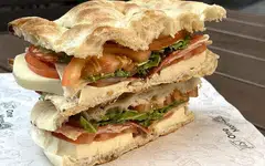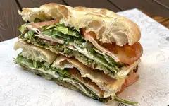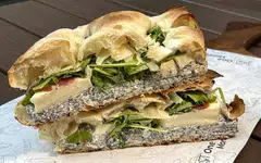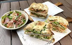 For a slightly spicy kick, go for the Focaccia Salami ($19+), which is stuffed with salame piccante (a spicy Italian cured meat), porchetta (Italian boneless pork roast) and thick, round slices of firm mozzarella cheese. Caramelised onion lends a toasty sweetness to the sandwich which is also stuffed with Italian arugula.