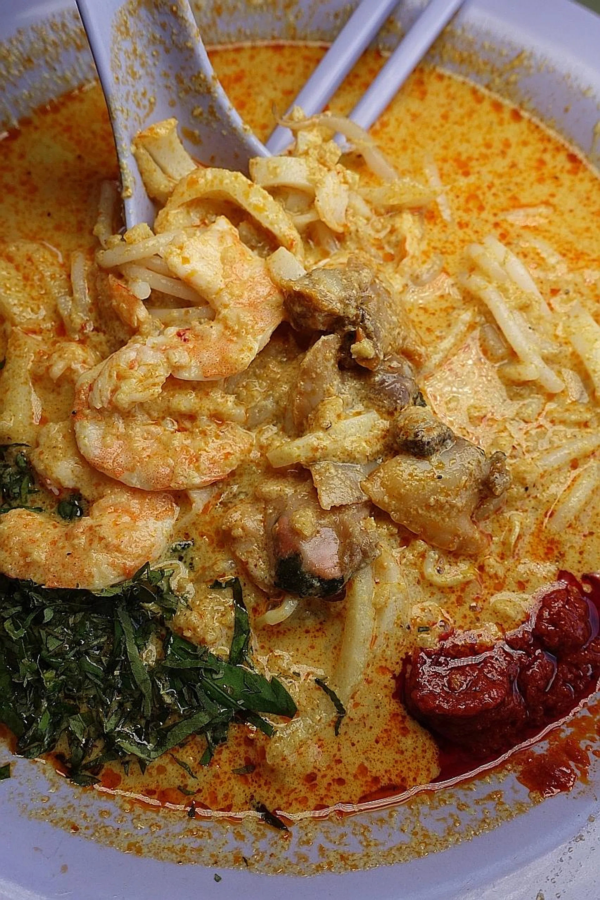 Keeping with tradition, he blanches the bee hoon in the simmering laksa curry and tops it with prawns, fish cakes, a healthy bunch of laksa leaves and bean sprouts.