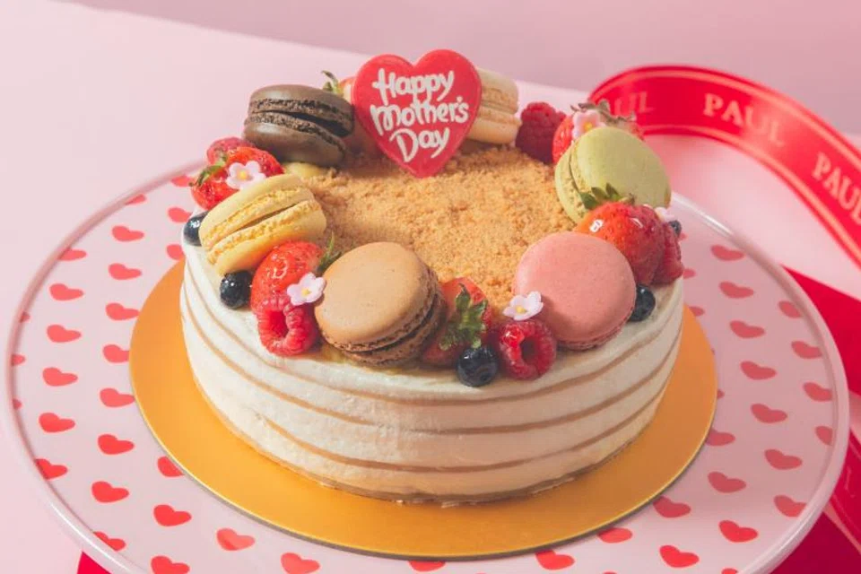 Paul Bakery's honey cloud cake ($88) is a very pretty cake with a crown of French macarons, and fresh strawberries, blueberries and raspberries, and layered with yoghurt and a light apricot glaze.