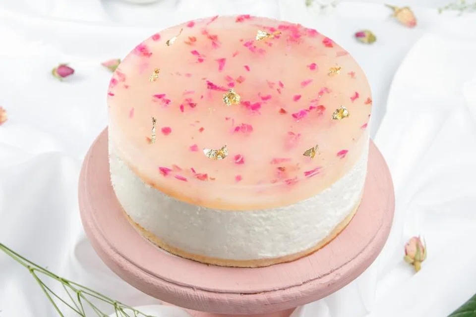 The blend of soft rose-chiffon base, lychee water-infused cream cheese, chopped lychees, bird's nest and rose petals is light and fragrant.