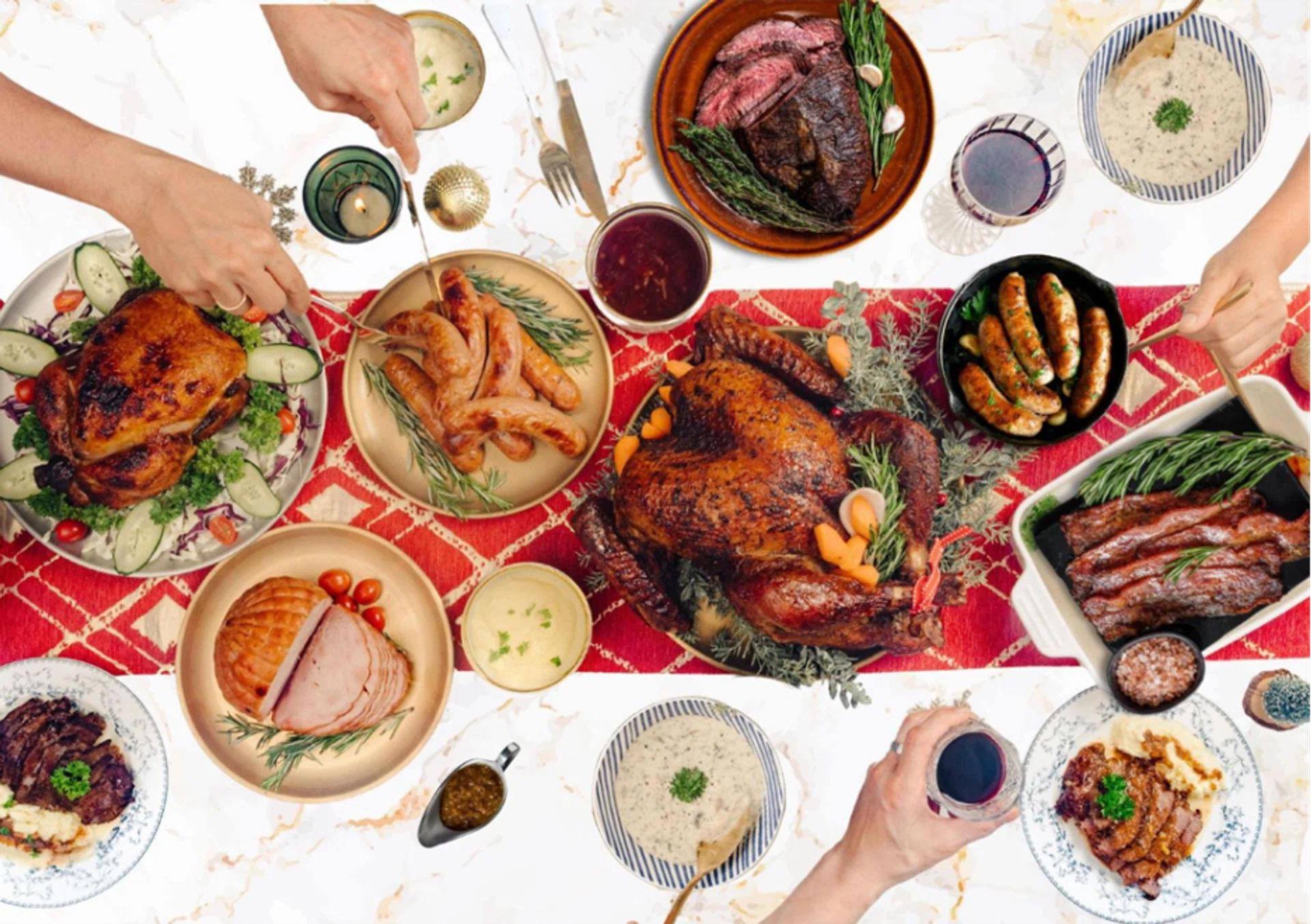 Festive Family Feast Set C ($288) Includes a 4.5kg whole roasted turkey with pork chestnut stuffing, 1kg roasted ribeye beef, beddar-cheddar smoked sausage, champagne ham, smoky streaky bacon, mushroom soup, cranberry sauce and brown gravy sauce.