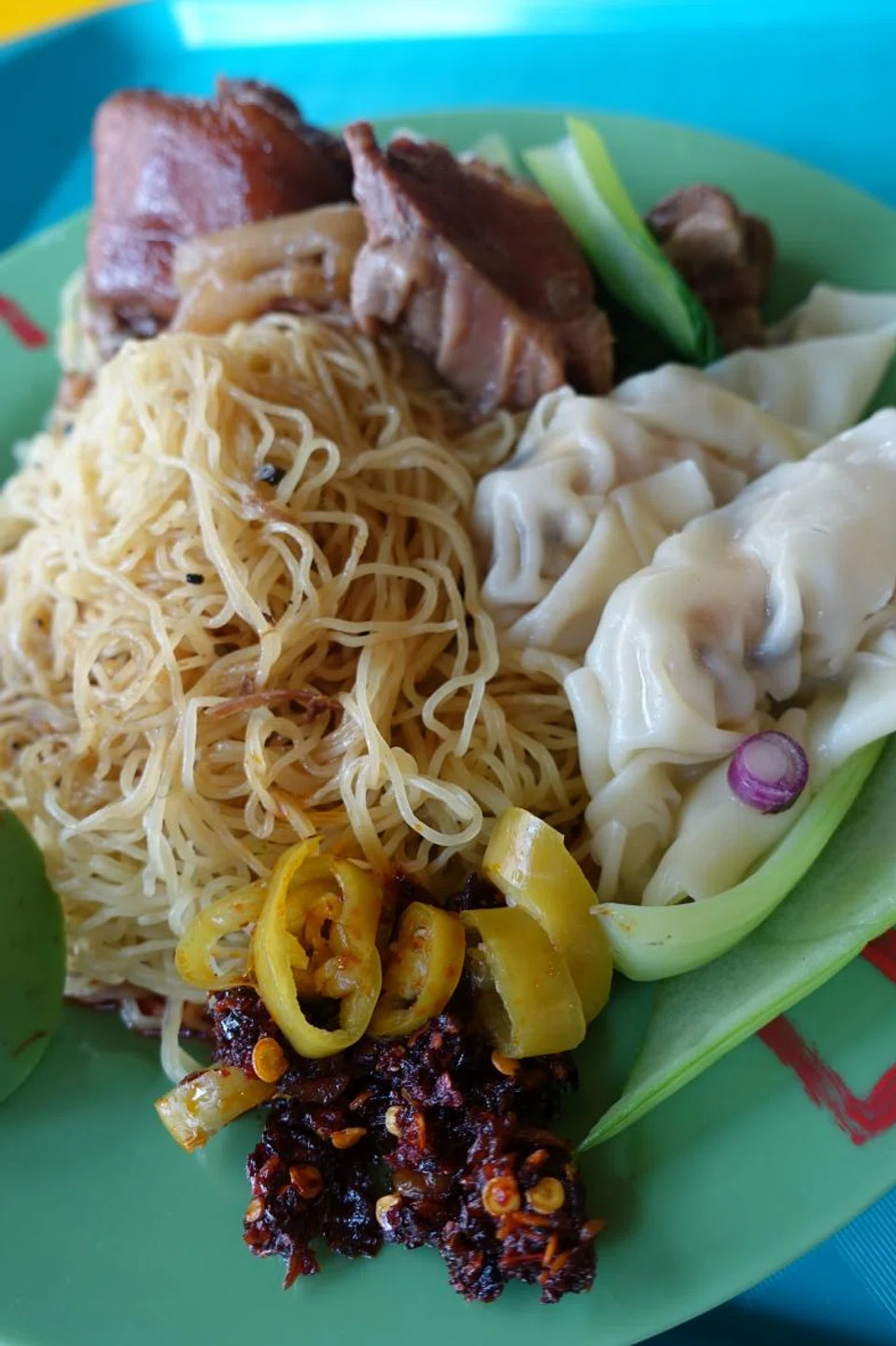 The few leaves of chye sim add colour and texture but his bold and fat wontons take the whole plate of noodles to home base.