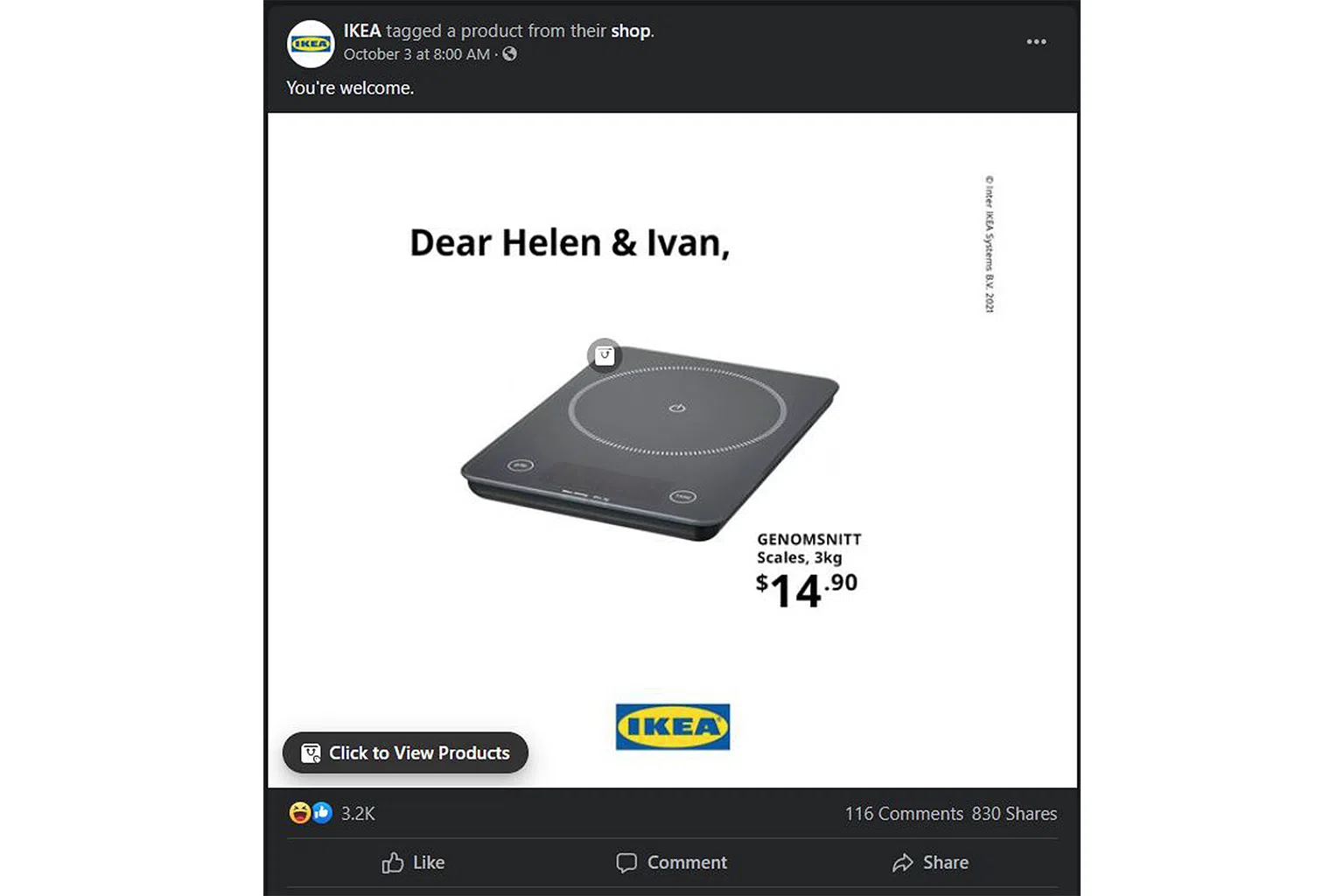 Ikea simply posted a picture of a weighing scale with the caption: "You're welcome".