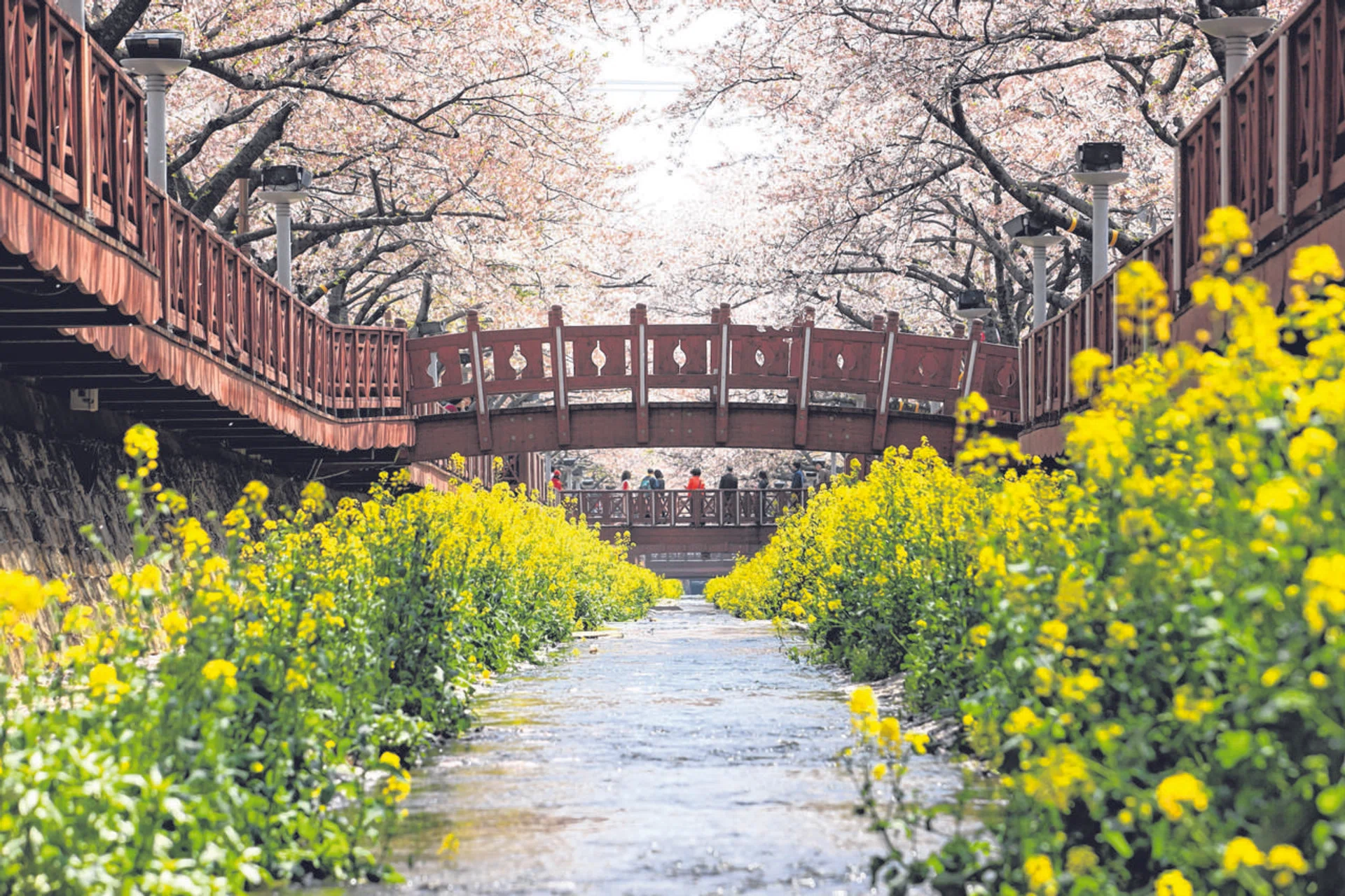 In particular, a 1.5km-long section of Yeojwacheon Stream is lined with cherry blossoms, creating a tunnel of white petals.
