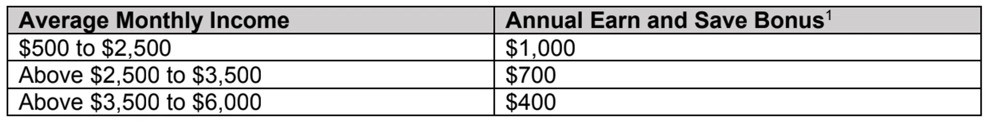 Eligible working seniors will receive the following Earn and Save Bonus, with a higher Bonus given to those with lower monthly incomes: