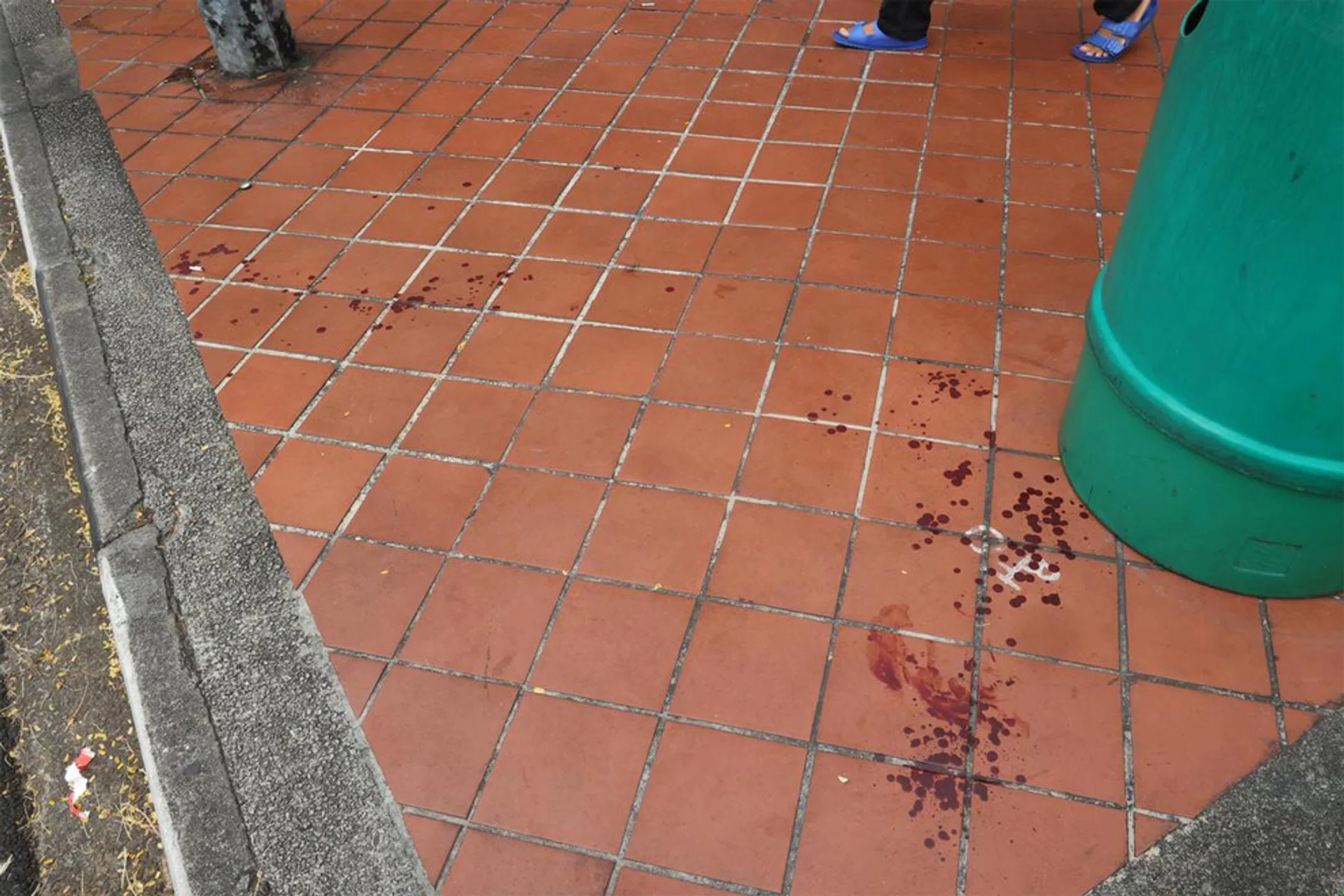 Bloodstains were visible near a dustbin and on the surrounding pavement.