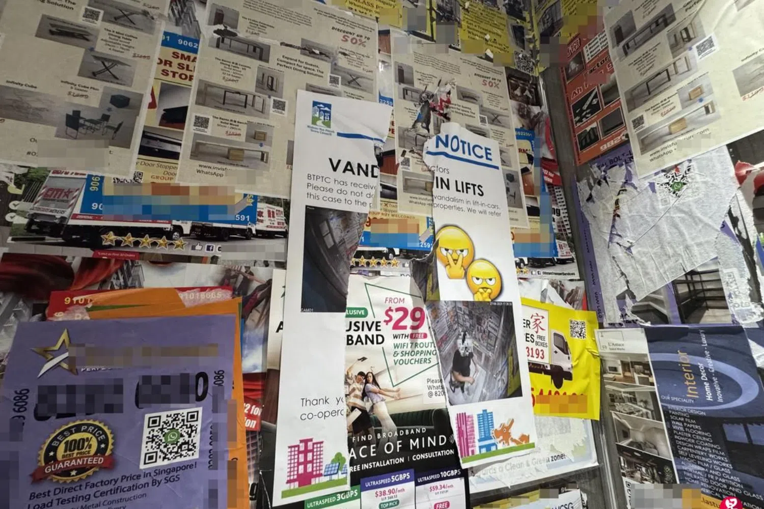 According to Shin Min Daily News, flyers were found plastered on lifts, unit doors, and even inside units - including areas not designated for such posters.