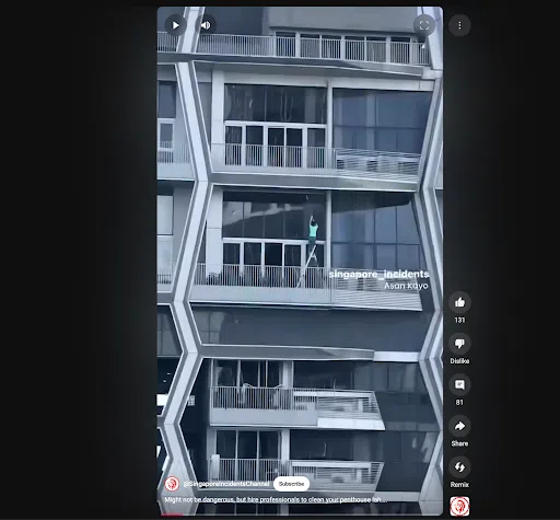 A video that shows a woman on a frame ladder cleaning the balcony window of a penthouse unit at V on Shenton has gone viral.