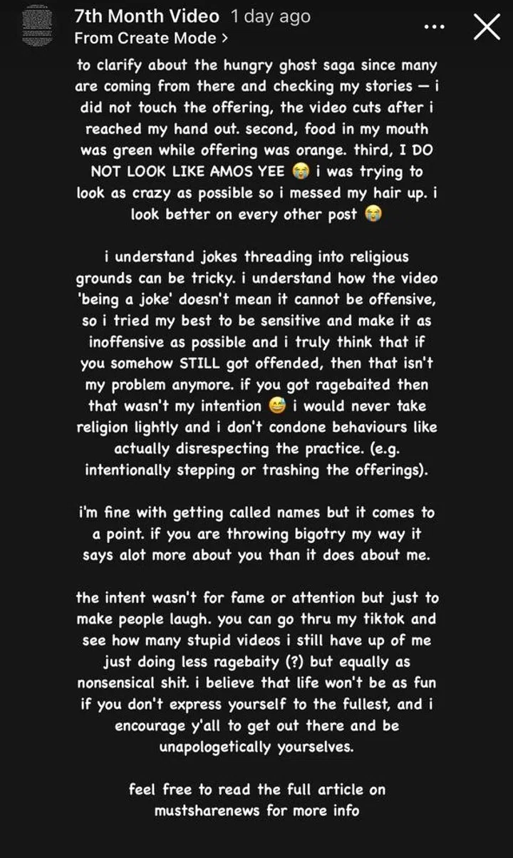 'I didn't actually do it': TikToker slammed for eating Hungry Ghost offerings clarifies