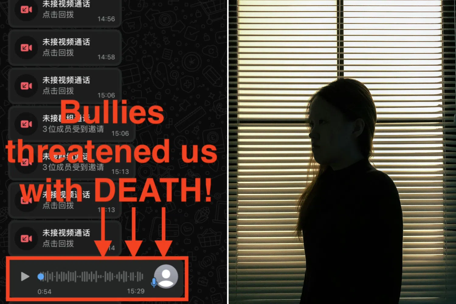 One caller allegedly identified her as the girl's mother before sending voice messages containing death threats - which she claims came from one of the boys accused of bullying.