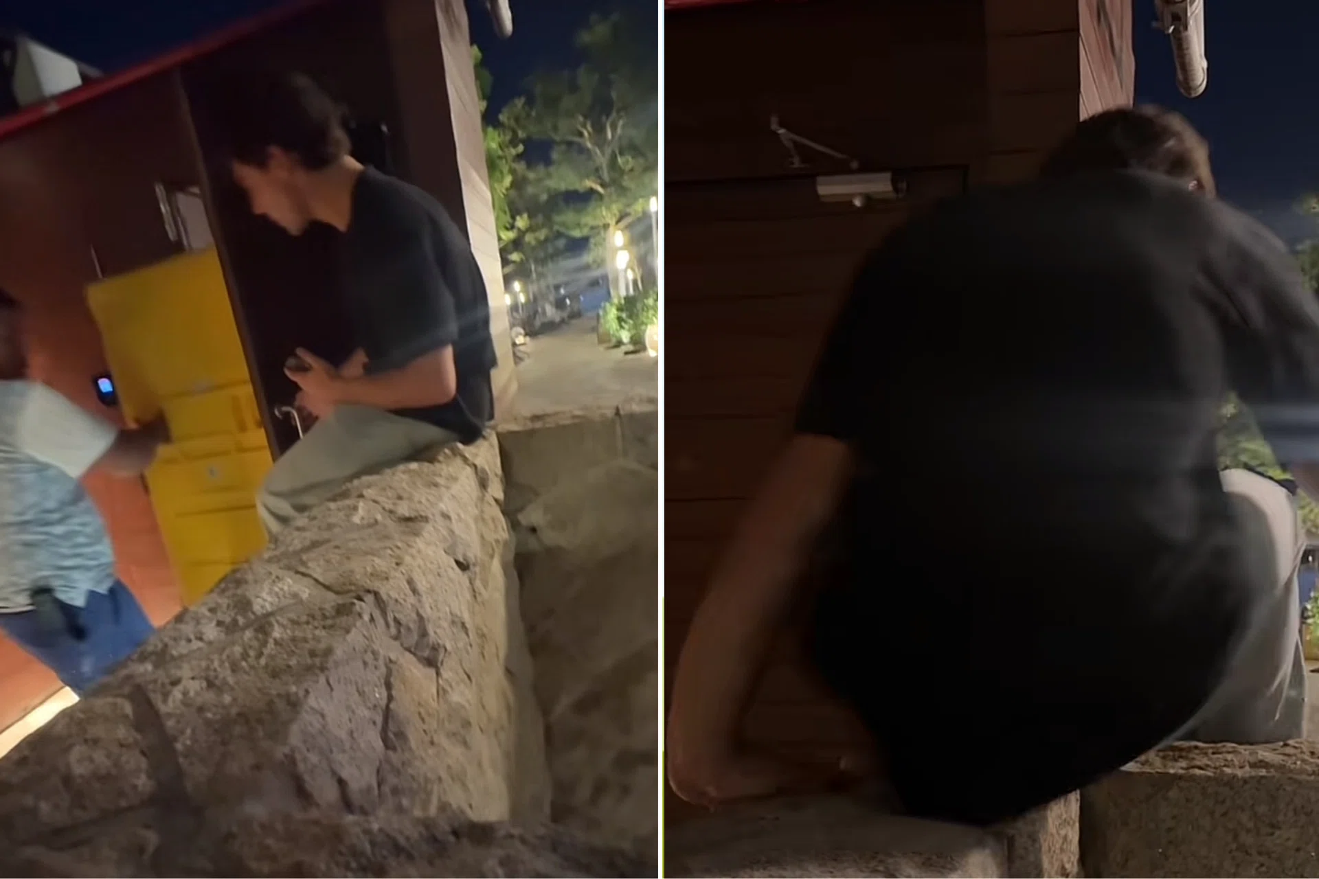 He is then seen climbing over a ledge purportedly located near a door that leads directly to the pool.