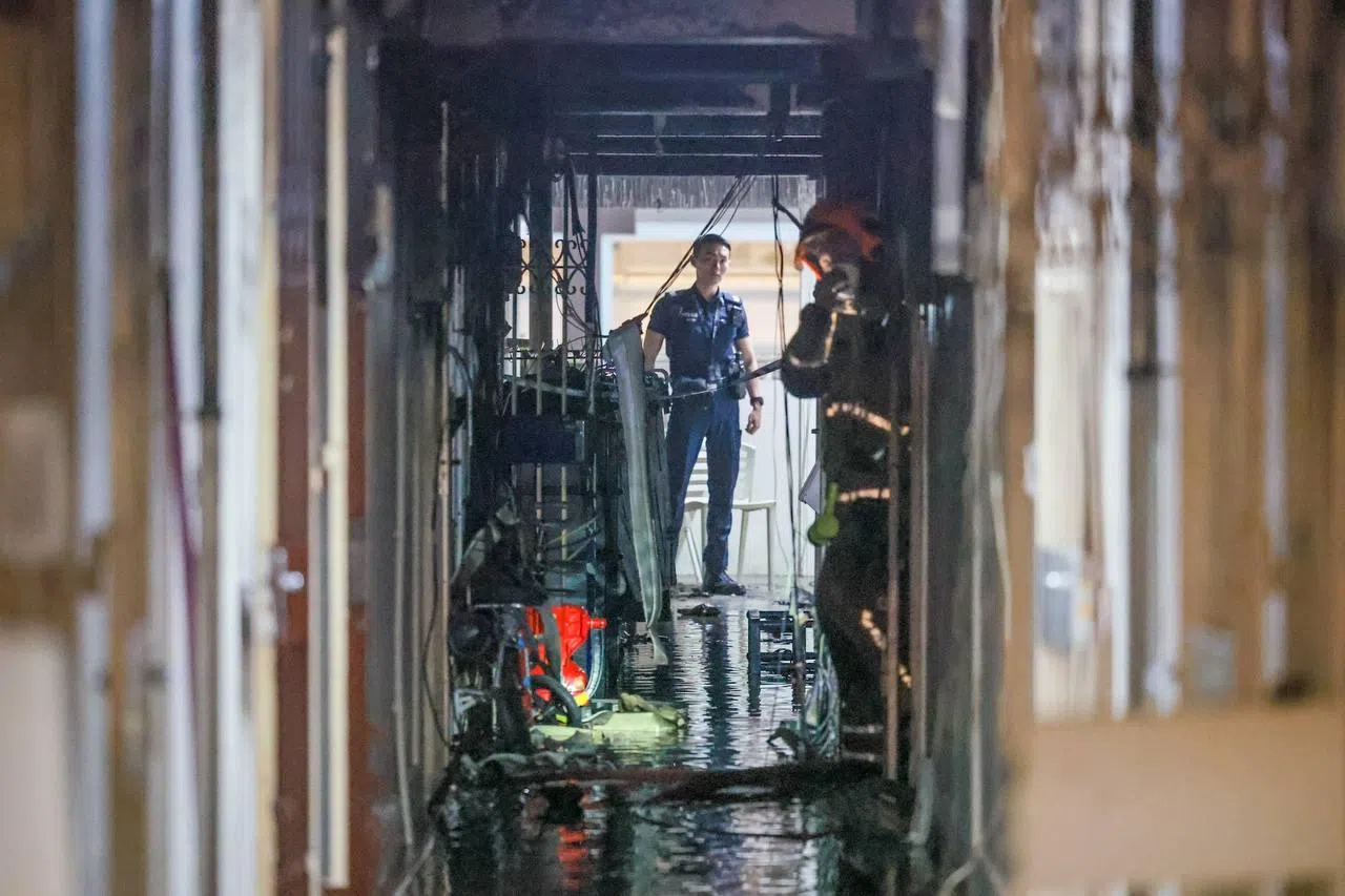 When firefighters arrived at the scene, the living room and bedroom of a unit on the fourth floor were in flames, with SCDF personnel making use of a water jet to extinguish the blaze.