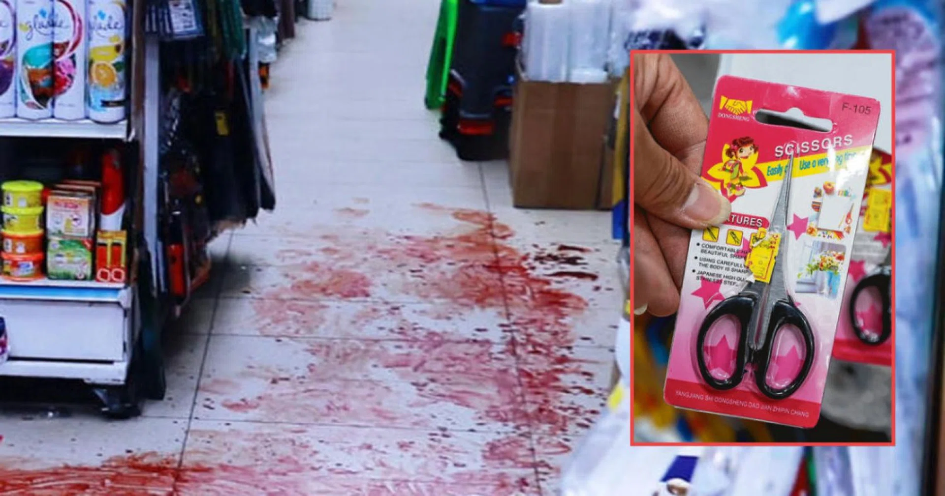 At a store selling household items at Hougang Green Shopping Mall, passers-by were shocked to witness a grisly scene of a 45-year-old man stabbing himself with a pair of scissors after being caught stealing items from the store.