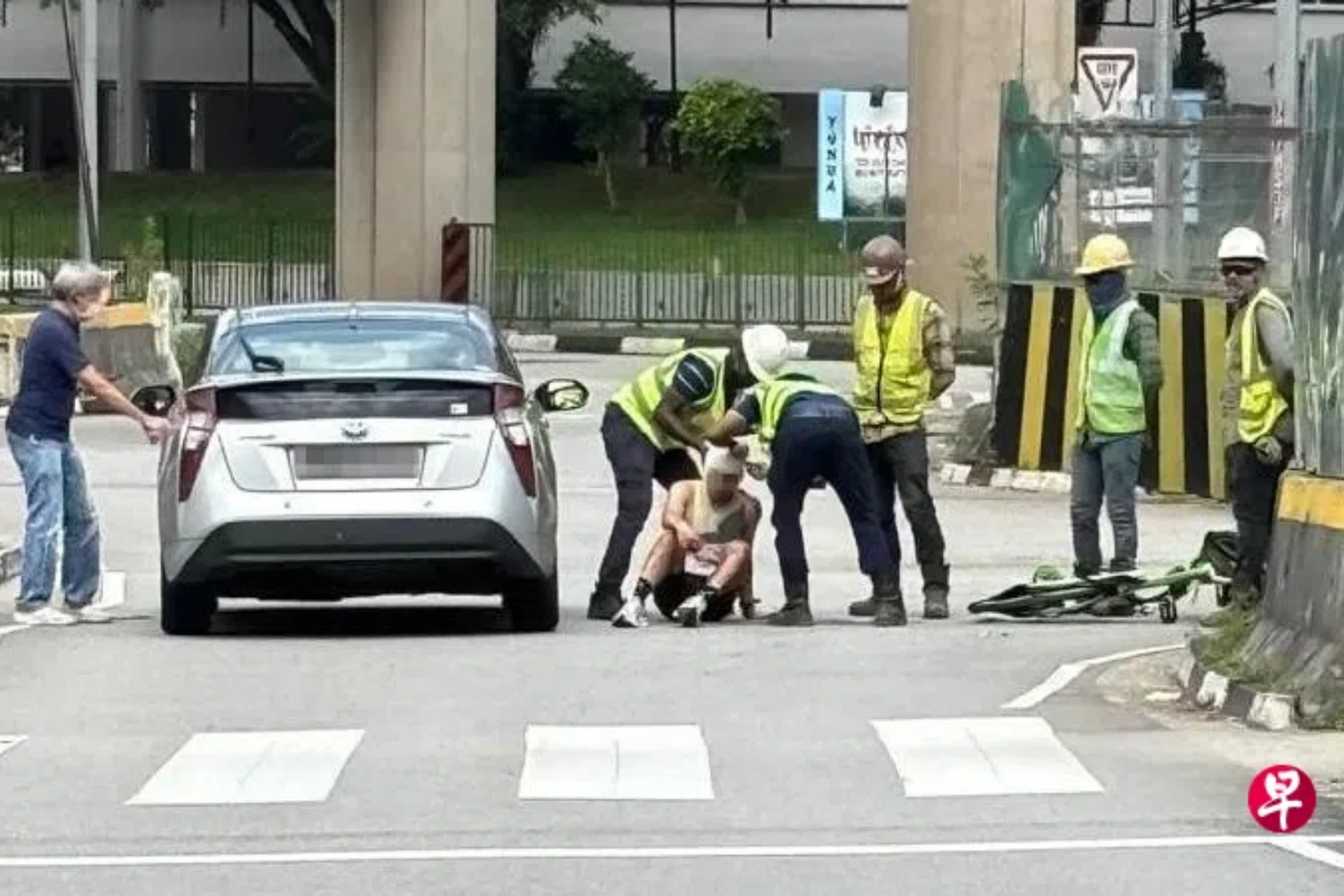 A man in shorts is seated on the ground as several uniformed migrant workers bandage his head with gauze. A white-haired man believed to be the driver is also pictured next to the car.