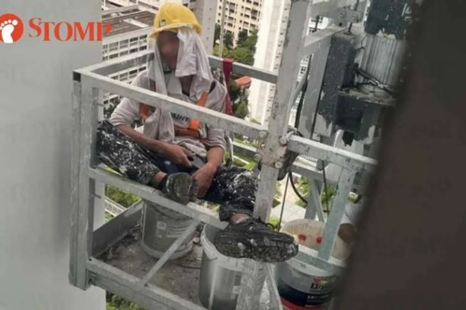 A resident of McNair Towers in Boon Keng was concerned to see a painter taking a nap in a gondola hanging high outside the building.