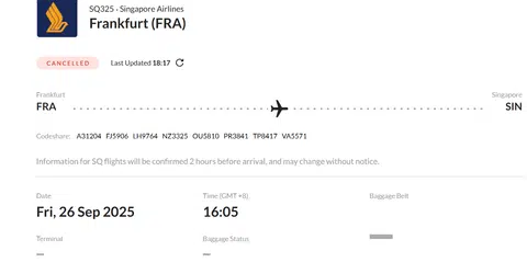 The Changi Airport website shows the inbound flight, originally scheduled to arrive at 4.05pm on Sept 26, was cancelled.