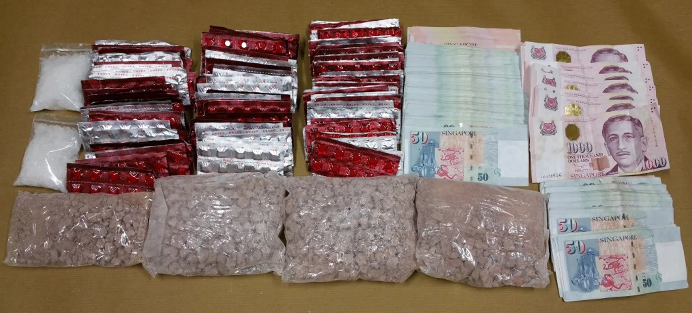 They include about 1.8kg of heroin, 1,462 nimetazepam (Erimin-5) tablets and 454g of methamphetamine or "Ice".