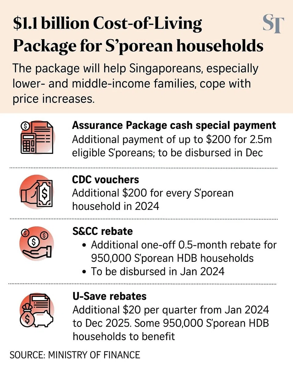 Some 2.5 million adult Singaporeans will receive an additional cash payout of up to $200 in December, and every Singaporean household will receive $200 in Community Development Council (CDC) vouchers in 2024 to help cope with the rising cost of living.