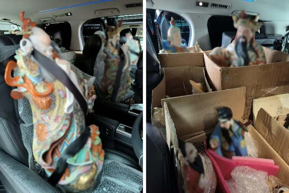 Officers discovered undeclared items in two vehicles. A further search uncovered several undeclared invoices. Photos from the Singapore Customs showed statues of deities.
