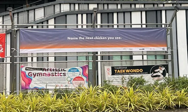 The two banners involved read "Choose one apartment window above to look at. Keep staring until the inhabitant catches you staring" at Duxton Plain Park and "Cover your ears while crossing the road" at Tanjong Pagar Plaza.