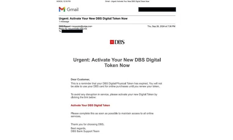 In these cases, victims would receive an e-mail or text message supposedly from DBS urging them to click on an embedded online link to resolve an urgent issue with their accounts or digital tokens, or to participate in deals, promotions or membership applications.