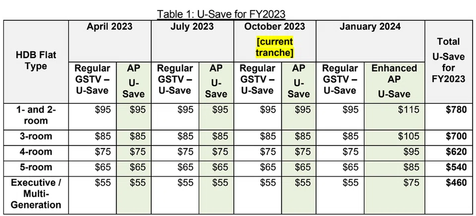 About 950,000 Singaporean households living in Housing Board flats will receive U-Save and service and conservancy charges (S&CC) rebates in October, as part of the Goods and Services Tax Voucher (GSTV) scheme and Assurance Package.