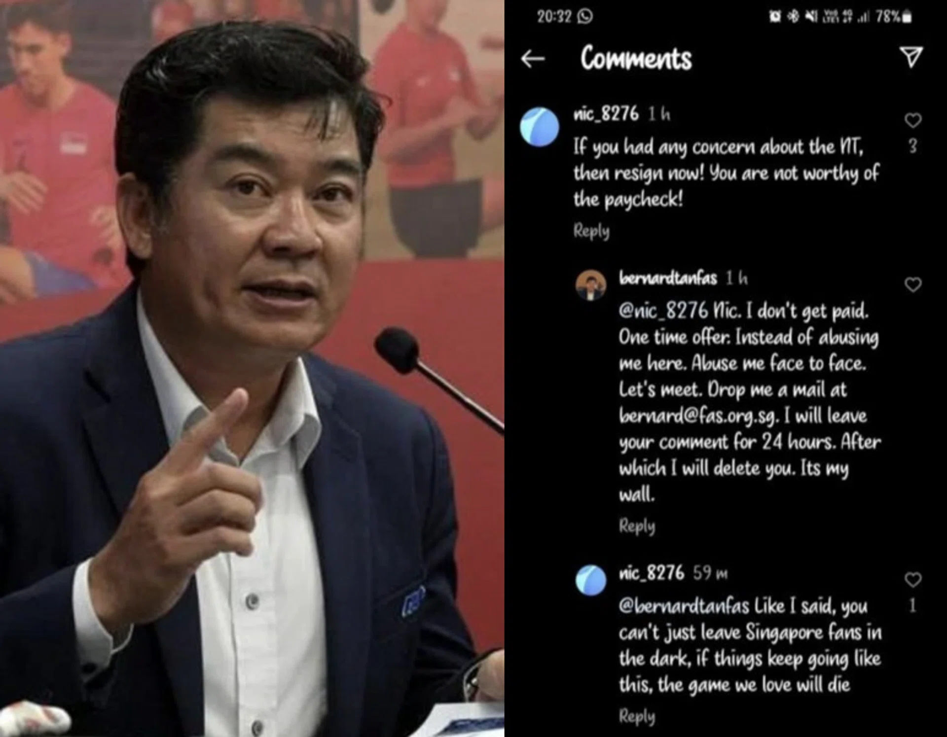 One of them even went straight to interim Football Association of Singapore (FAS) president Bernard Tan's Instagram page to voice his disapproval, calling for Tan to step down from his post.