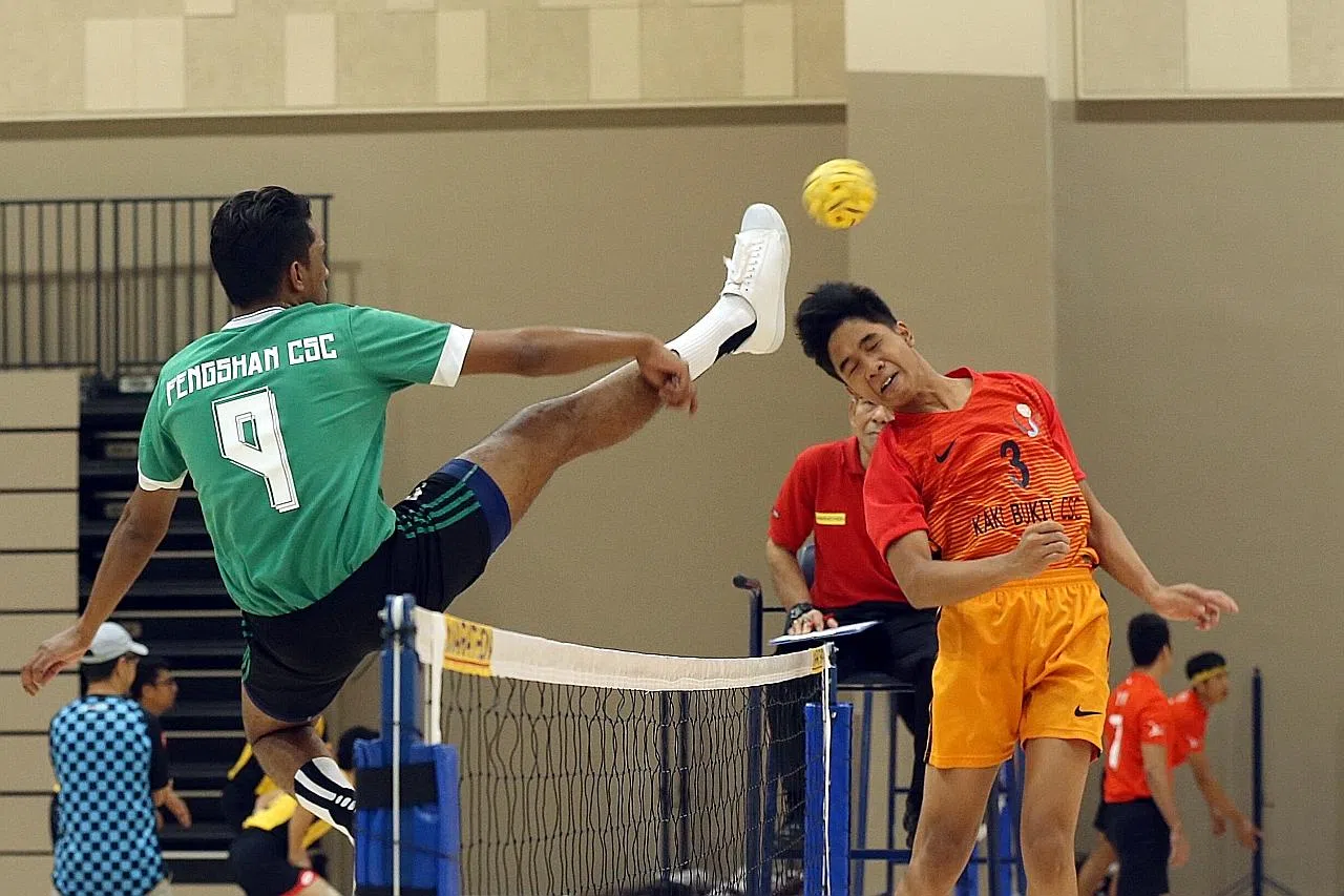 There were a number of aerial tussles on display in the sepak takraw clash between Kaki Bukit Community Sports Club and their rivals from Fengshan on the opening day of the Singapore Community Games 2017. The annual event, featuring six sports, was launched yesterday by Deputy Prime Minister Teo Chee Hean at Our Tampines Hub. It aims to promote sports among the community.