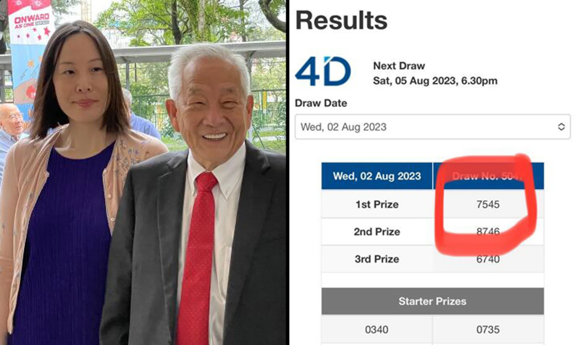 Sharp-eyed netizens have noticed that the first prize of Wednesday's (Aug 2) 4-D results is the combination of the ages of 75-year-old presidential hopeful Ng Kok Song and his 45-year-old fiancee Sybil Lau.