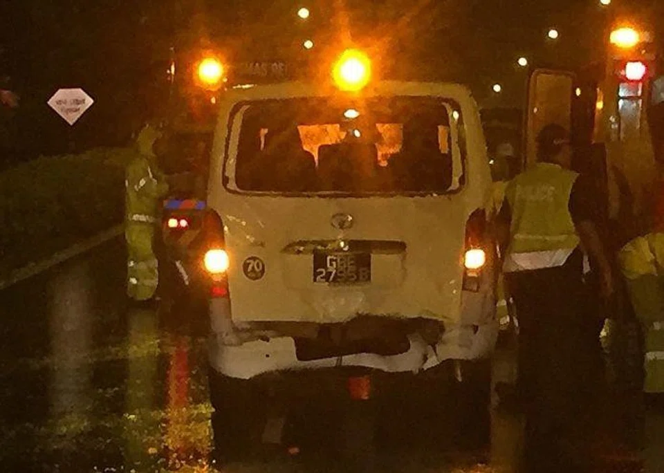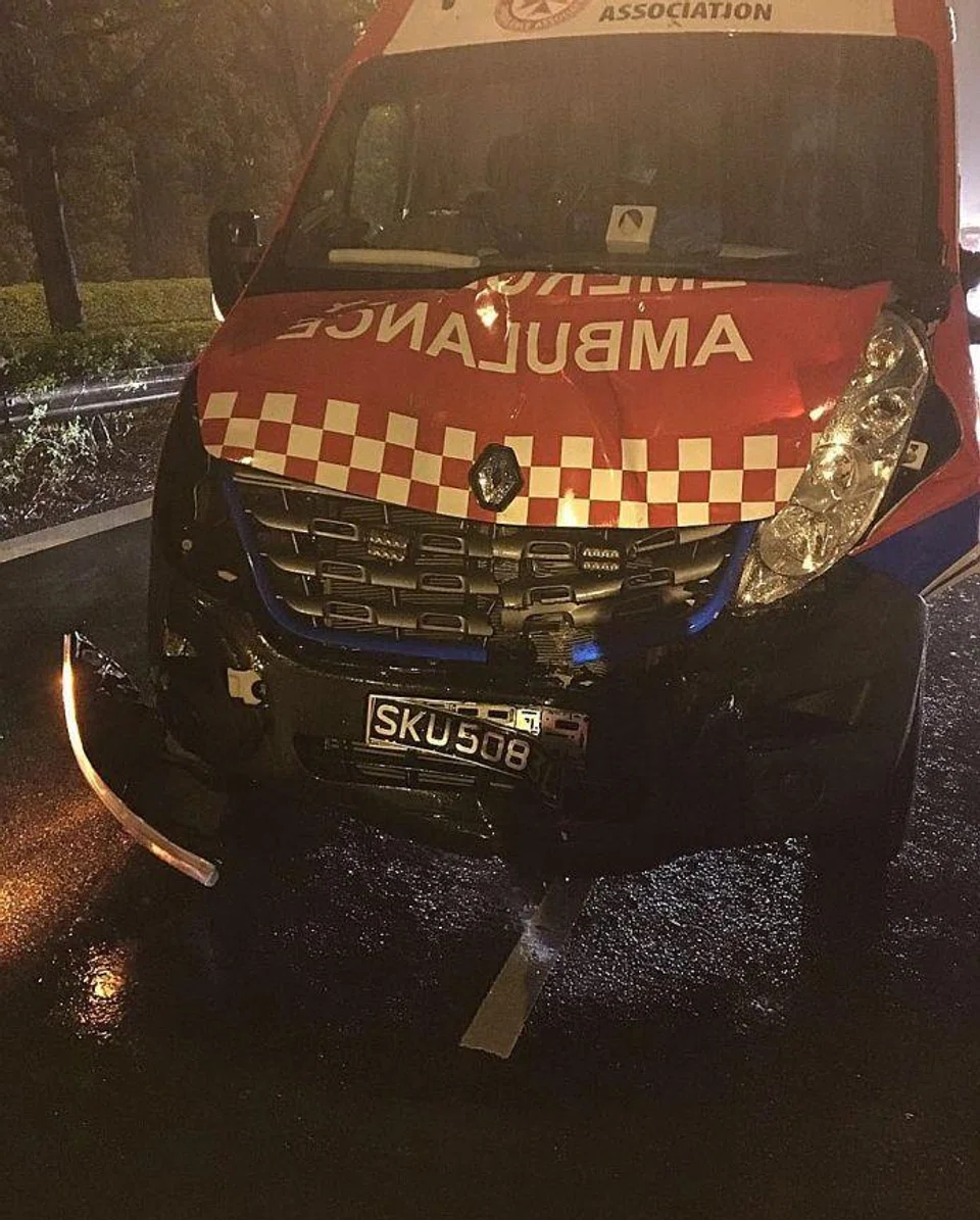 In heavy rain, the ambulance collided with a van that had allegedly braked suddenly on the Paya Lebar Flyover.