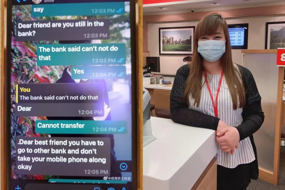 Ms Kristie Chiang, a customer service manager at OCBC Bank's Bedok branch, probed further, and she became suspicious when the 55-year-old customer said she had developed a relationship with a friend called "Andrew" after an introductory phone call in February and that the Swiss national, who was based in Turkey, needed financial help.