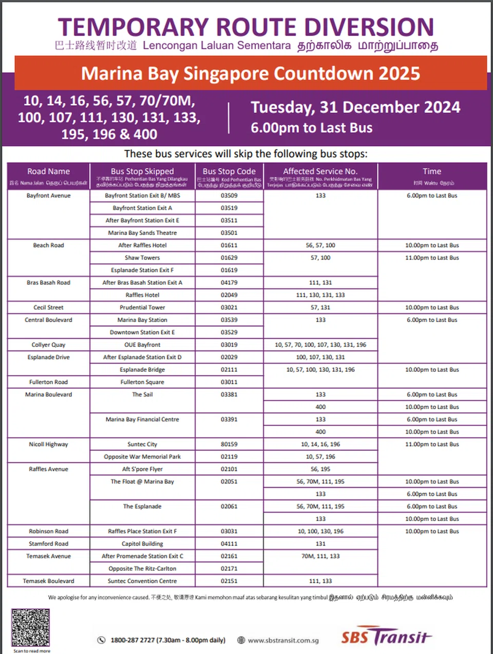 The Marina Bay Singapore Countdown 2025 will result in disruptions to 15 bus services: 10, 14, 16, 56, 57, 70/70M, 100, 107, 111, 130, 131, 133, 195, 196, and 400.