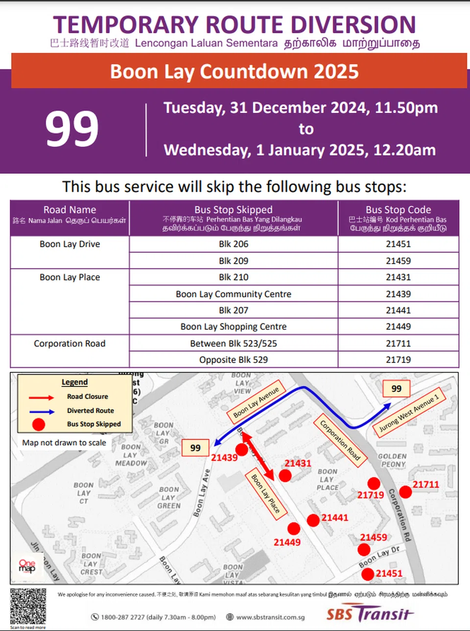 Due to the Boon Lay Countdown 2025 event, service 99 will bypass four pairs of bus stops along Boon Lay Drive, Boon Lay Place and Corporation Road from 11.50pm on Dec 31 to 12.20am on Jan 1.