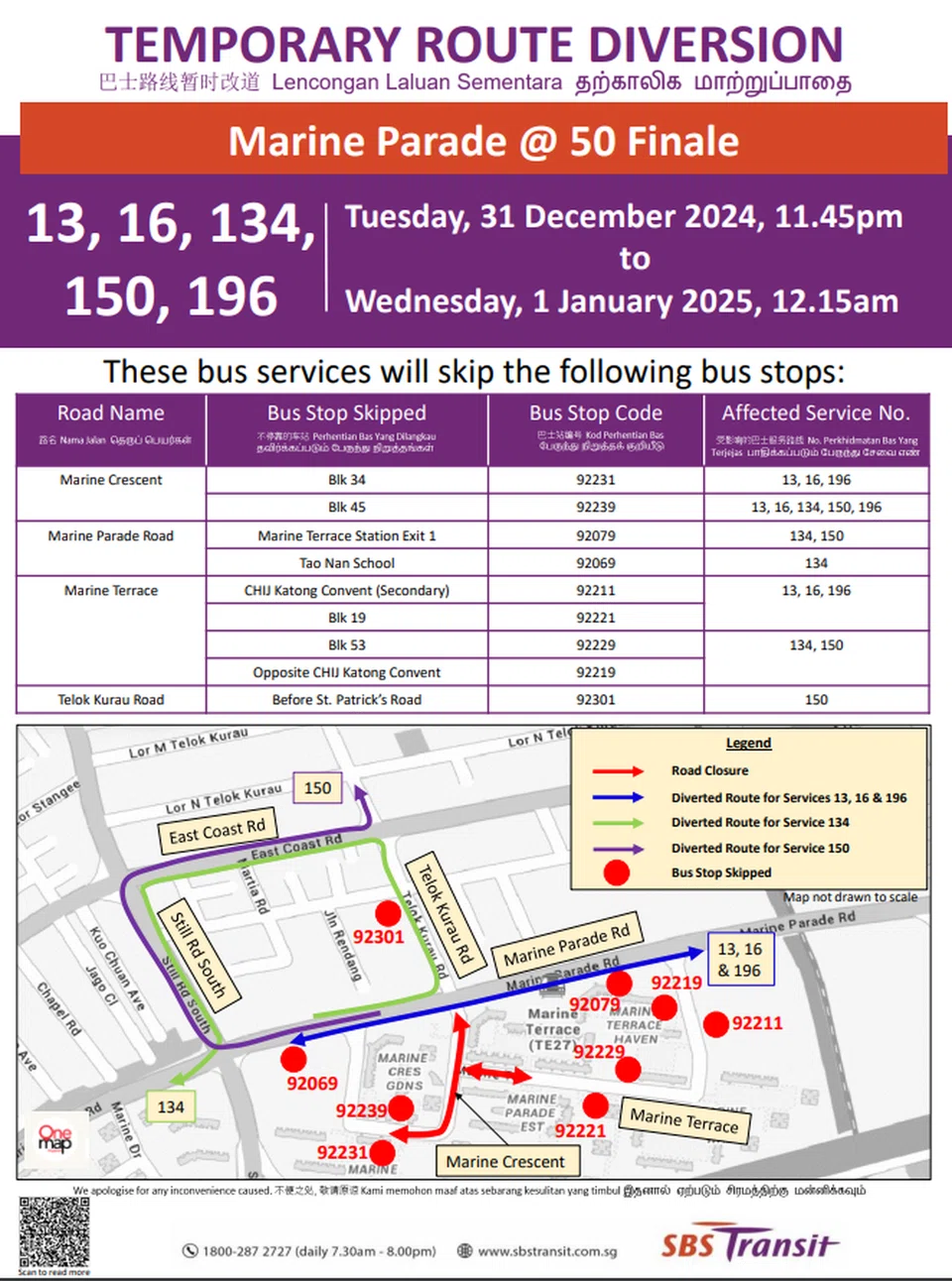 The Marine Parade @ 50 Finale will also see temporary diversions to five bus services: 13, 16, 134, 150 and 196.