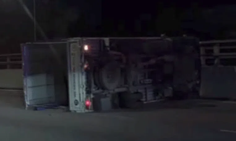 The footage also shows a car with a smashed bonnet near the ambulance and a lorry lying on its side in the right-most lane next to the road divider.