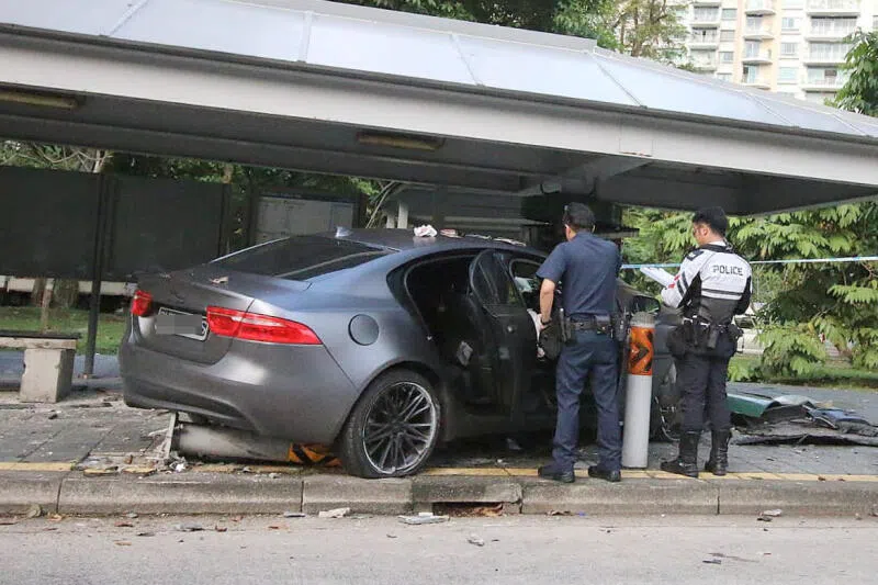 In photos that a reader shared with Shin Min Daily News showed that a car at the bus stop near the the junction Clemenceau Avenue and River Valley Road. It appeared to have crashed the pillar and bus-stop seat.