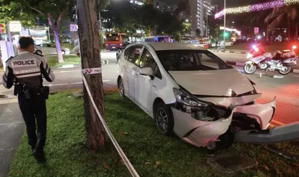 Car crashes into lamppost outside police station in Hougang